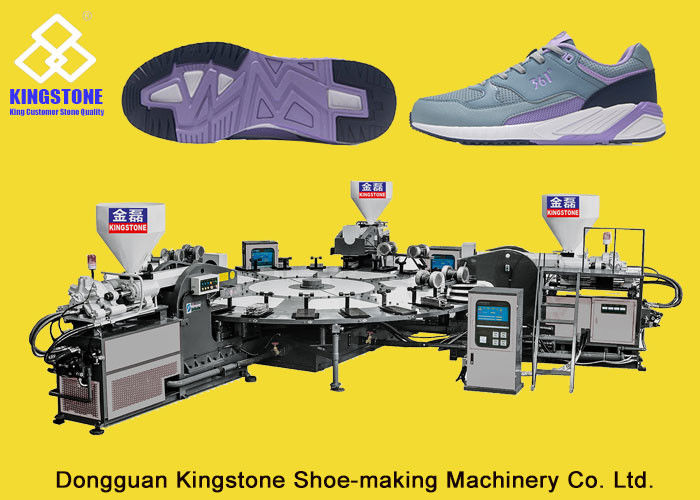 Deze machine is voor opbrengs/drie kleur één/twee outsoles met de materialen van pvc tpr, kan in sportenschoenen, leerschoenen, vrije tijdsschoenen, tennisschoenschoenen, enz. gebruiken.